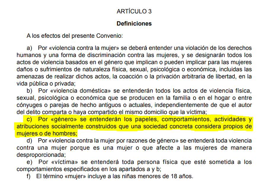 El género, como viene reconocido en el artículo 3 del Convenio de Estambul, son los estereotipos sexistas, mandatos sociales que impiden el libre desarrollo de la personalidad, que marcan socialmente lo que debe ser un hombre y lo que debe ser una mujer, y las características de su personalidad e intereses en base a su sexo. Por tanto, los mandatos de género son la base y cuna de la subordinación sexual de las mujeres. Es por ello que la abolición del género (es decir, de los roles y estereootipos sexuales) se encuentra en la agenda feminista internacional.